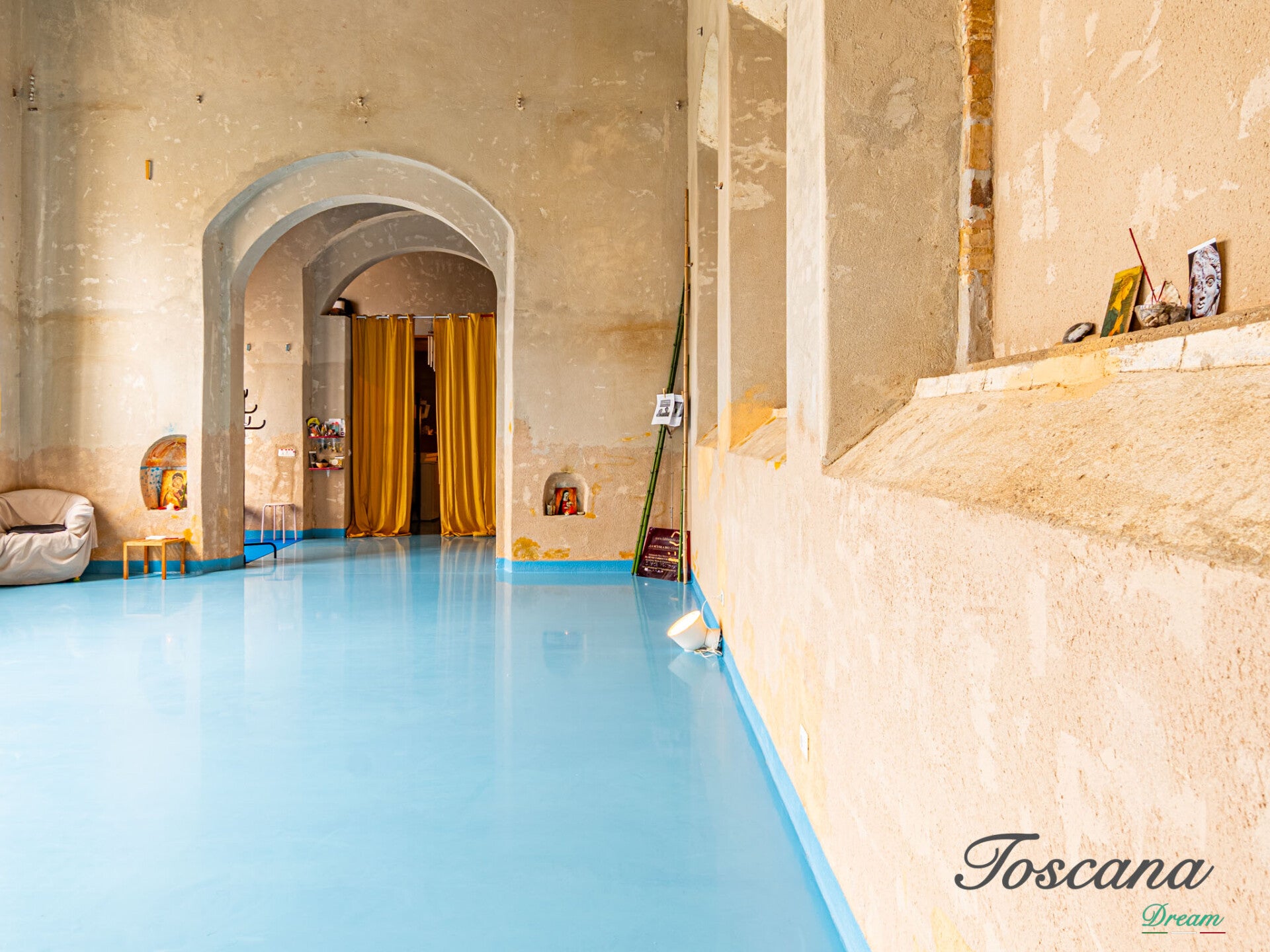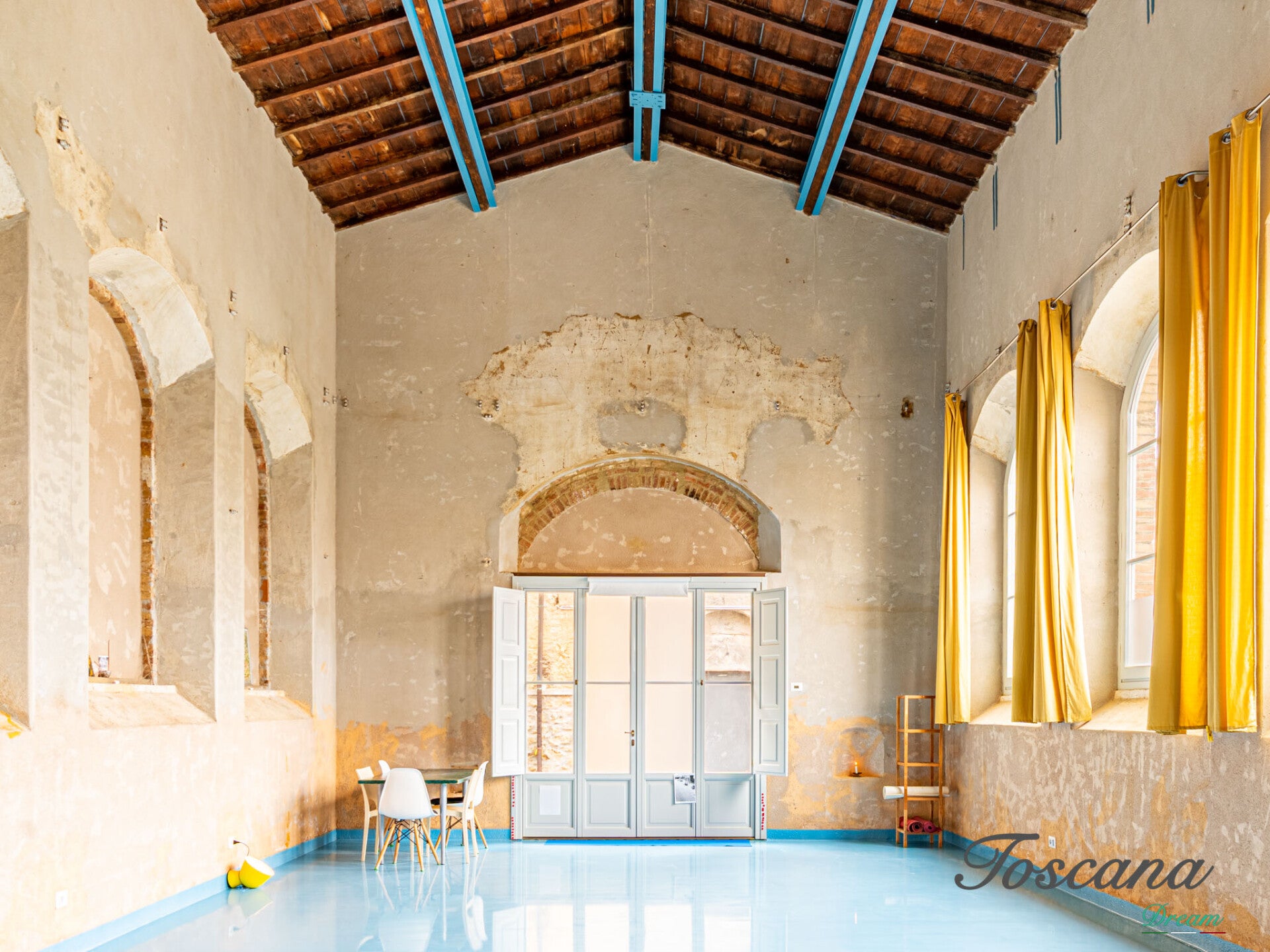 Il pavimento è stato realizzato in resina, una scelta ideale per pratiche come lo yoga. Il colore – un azzurro ispirato all’arte etrusca – è un omaggio alla terra in cui sorge l’edificio.
