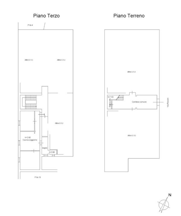 Terzo piano: corridoio, soggorno, due camere da letto matrimoniale, bagno con doccia.