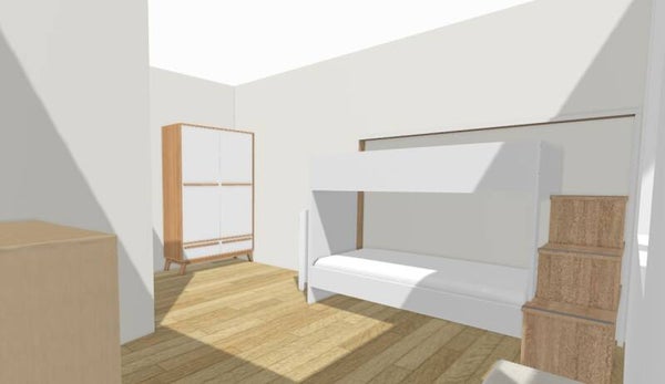 Secondo piano: soggiorno, cucina abitabile, bagno, due camere da letto.