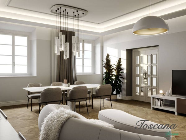 Ogni dettaglio, dai pavimenti alle finiture, riflette l’arte del vivere di lusso, unendo la maestosità del passato con il comfort contemporaneo.