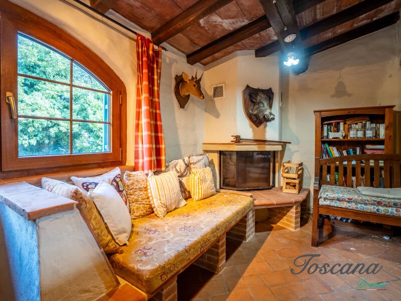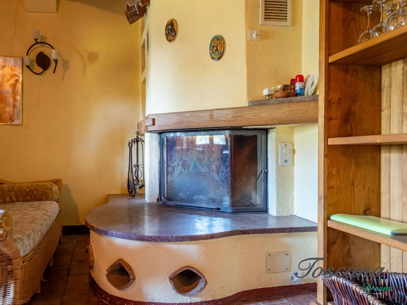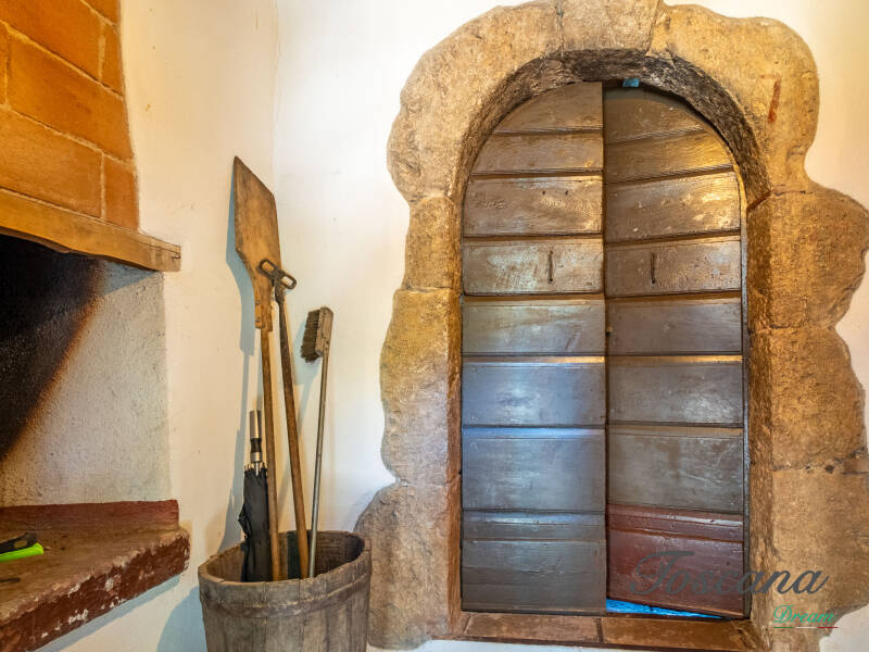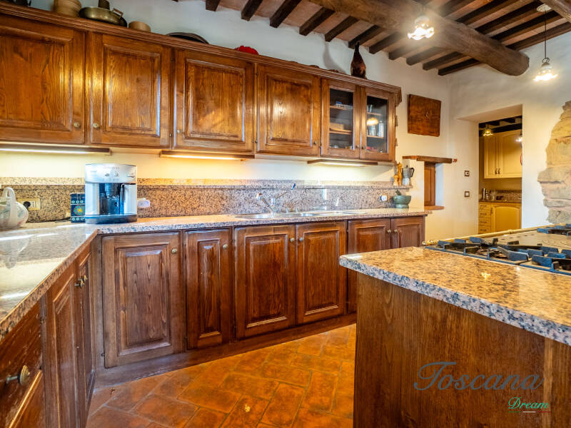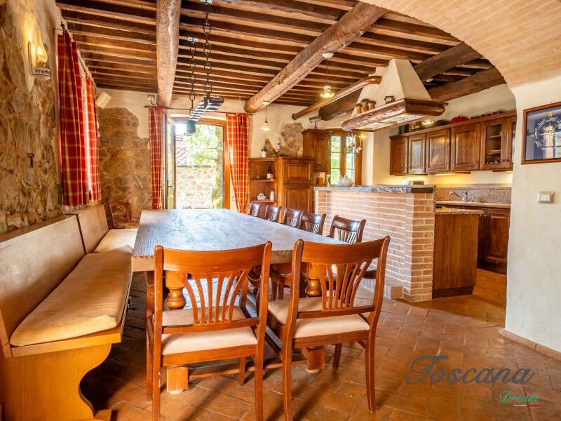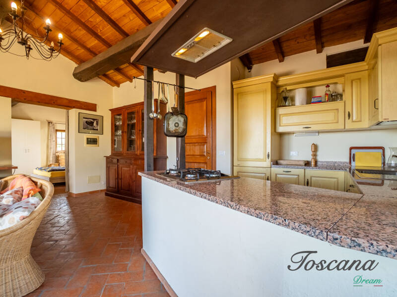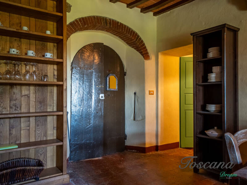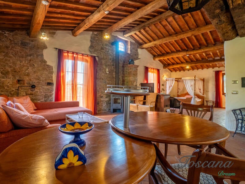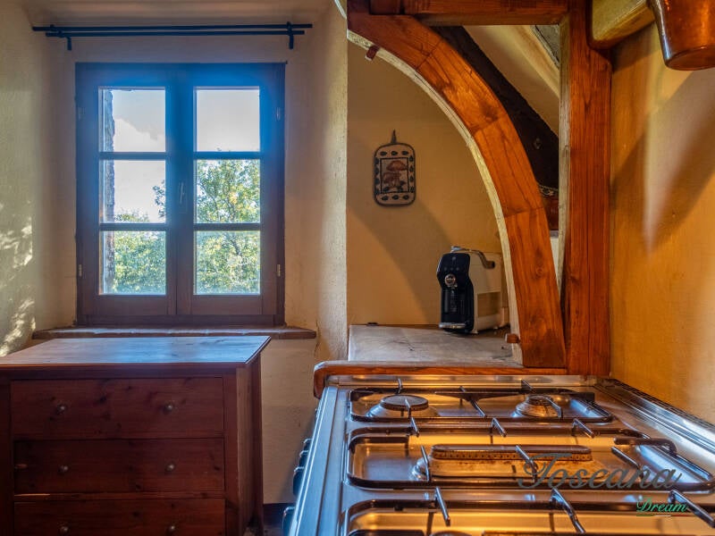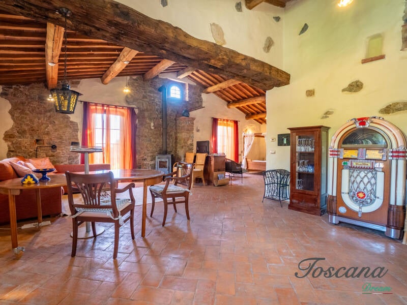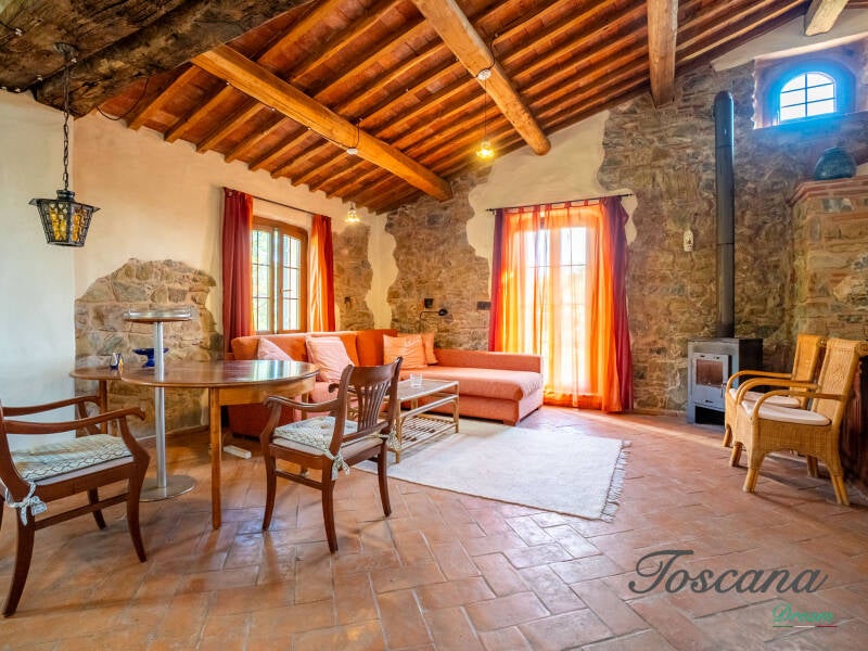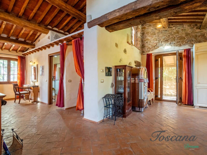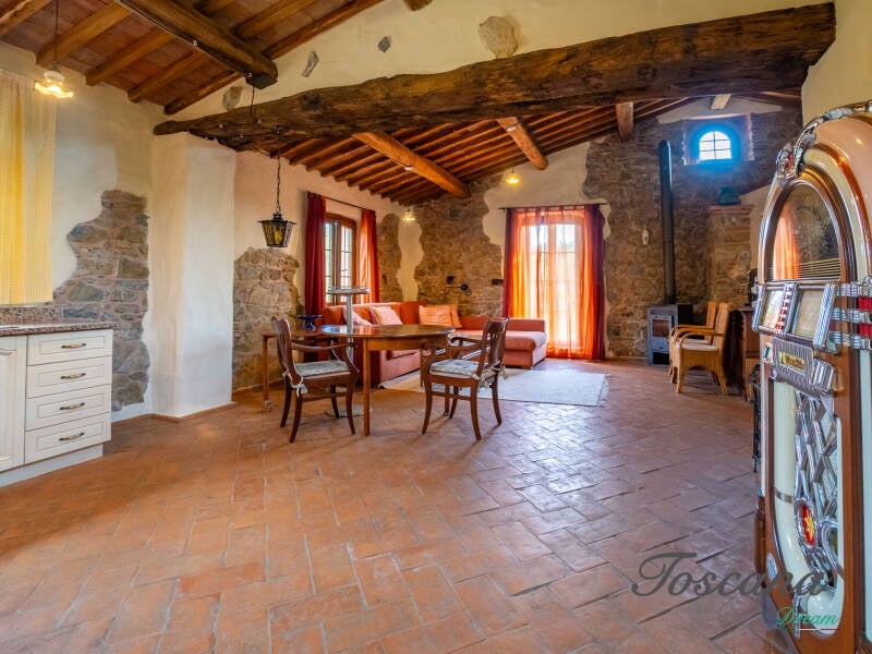 L’architettura è autenticamente toscana: muri in pietra, pavimenti in cotto, travi in legno a vista, dettagli artigianali. Una casa con anima.