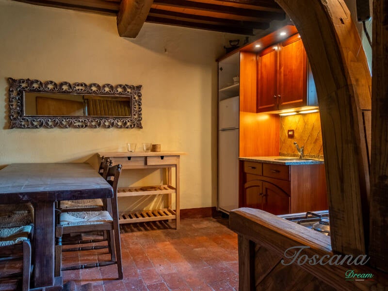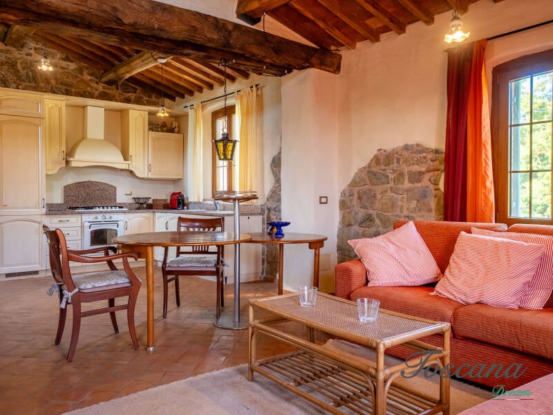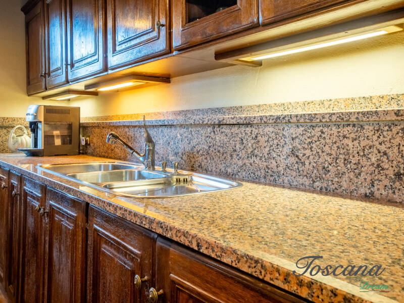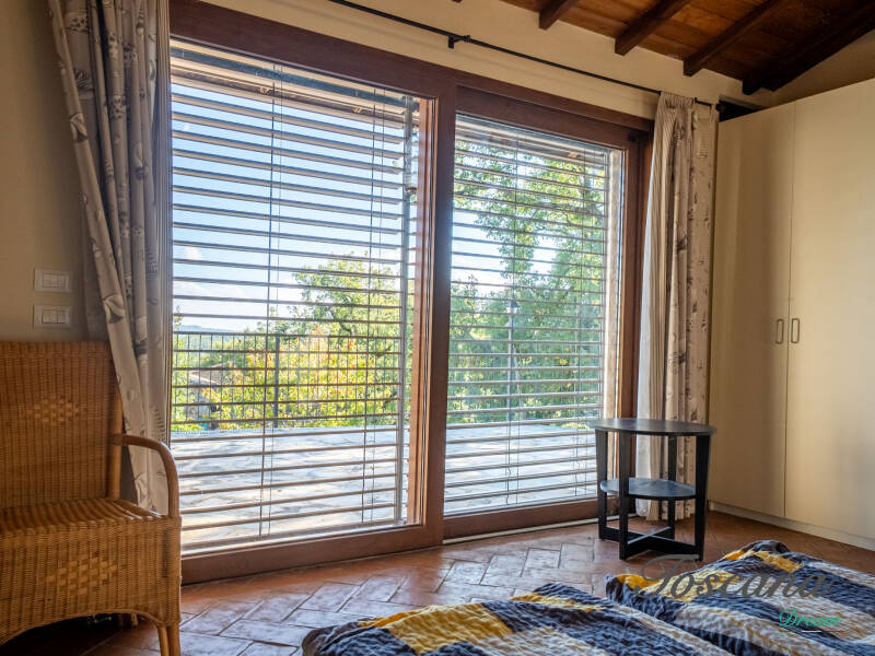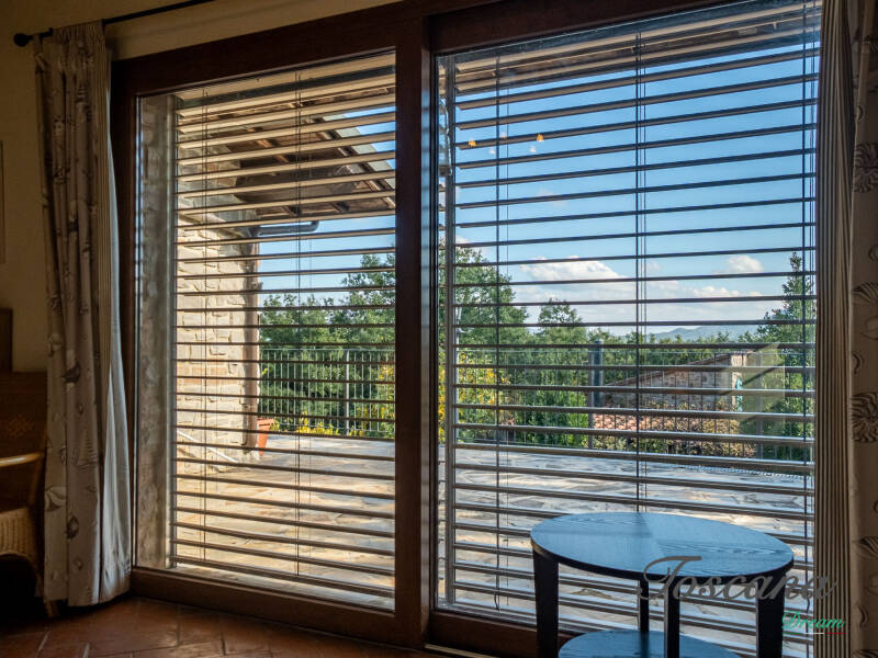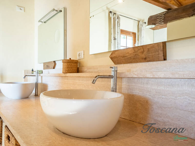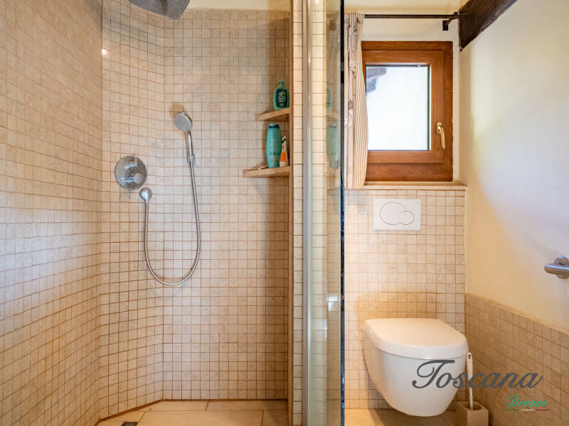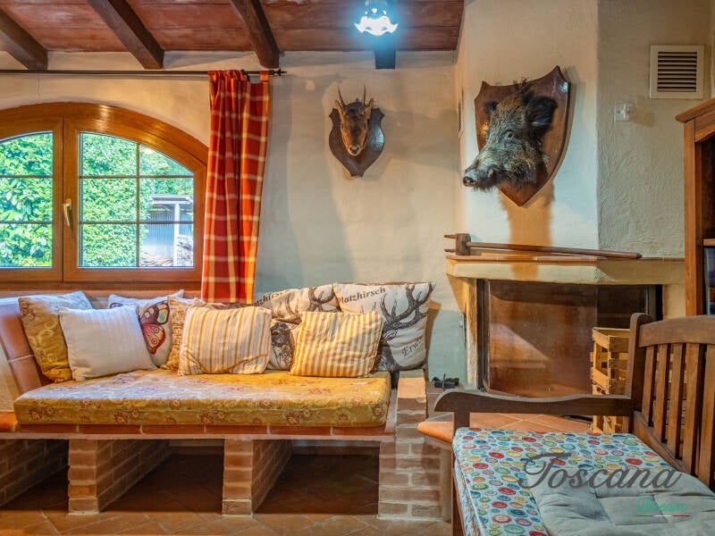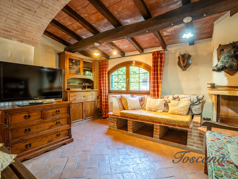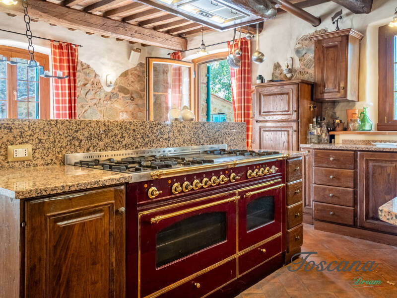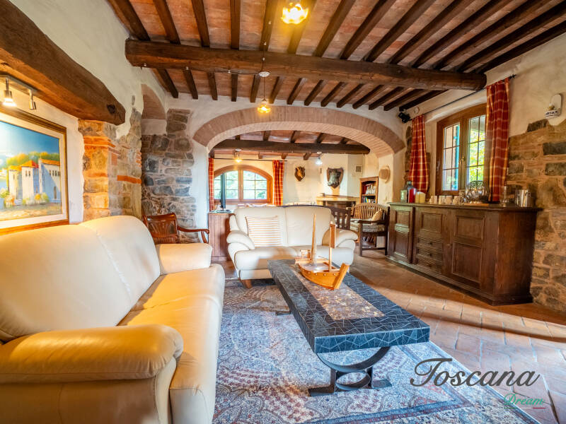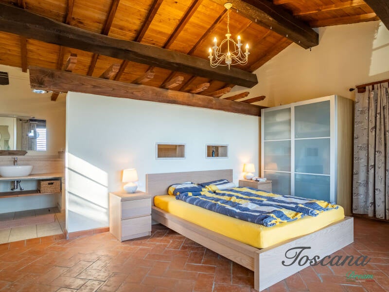L’architettura è autenticamente toscana: muri in pietra, pavimenti in cotto, travi in legno a vista, dettagli artigianali. Una casa con anima.