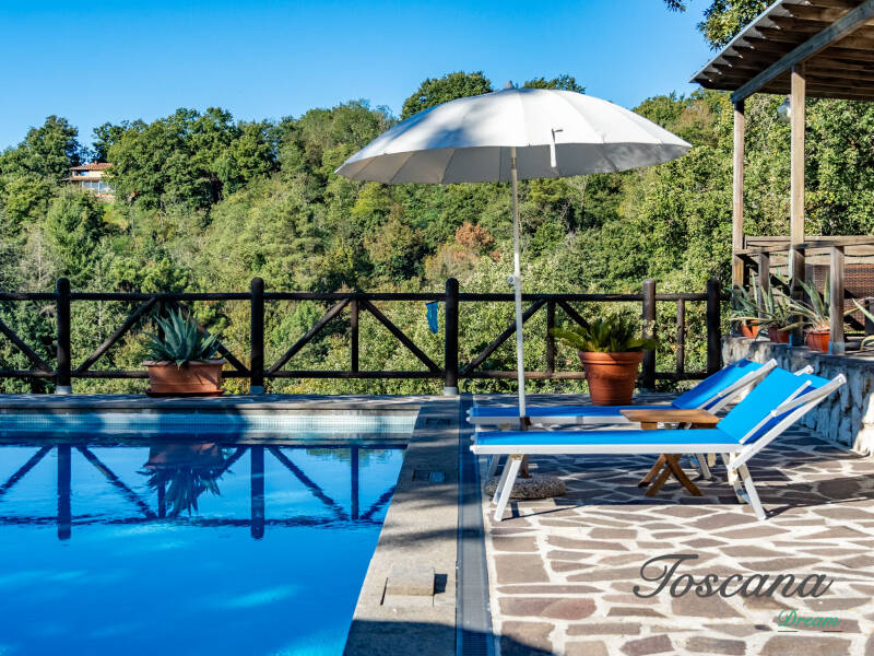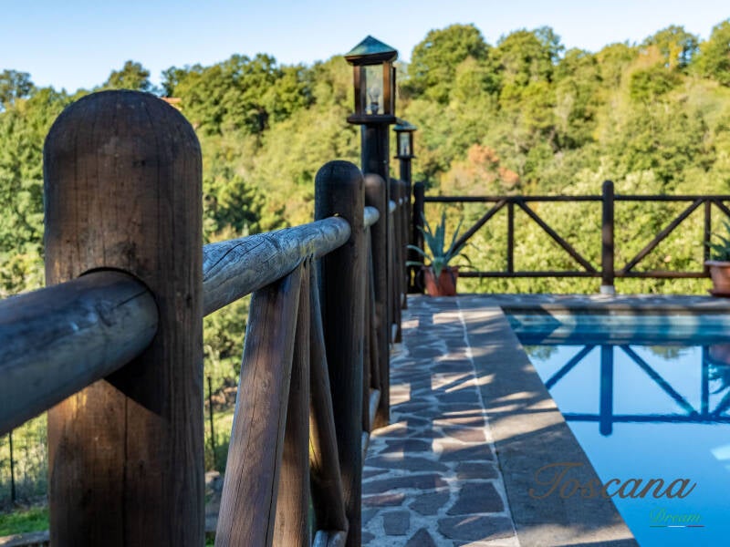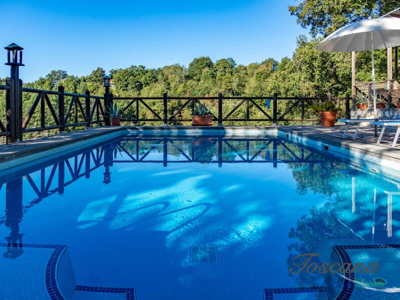 Una piscina panoramica con vista aperta, giardini curati, angoli ombreggiati sotto la grande quercia o la pergola, e boschi estesi creano un’atmosfera di rara qualità estetica.