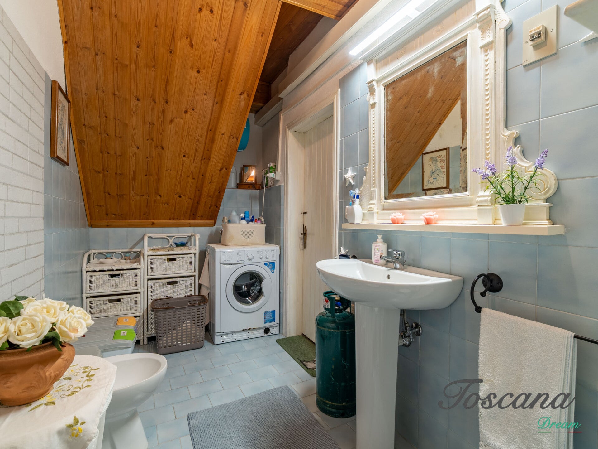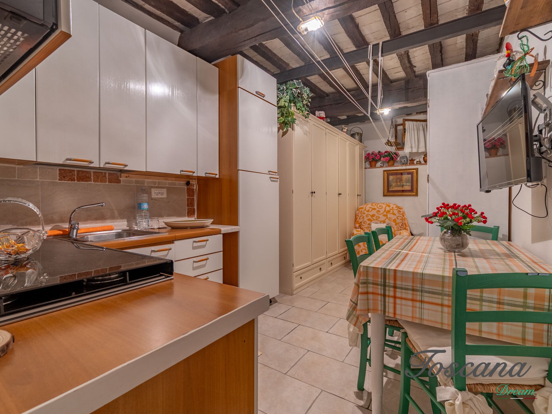 L’ingresso indipendente conduce al piano terra, dove troviamo un ambiente funzionale dotato di cucinotto e arredi e un bagno, perfetto come spazio di appoggio per ospiti, studio o zona indipendente per amici in visita.