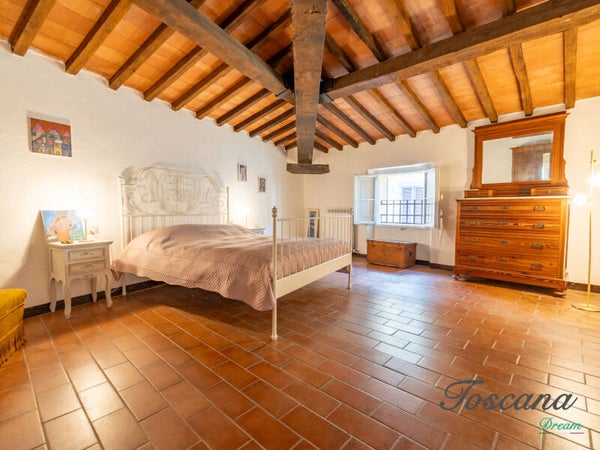 L’appartamento incarna perfettamente lo stile tipico toscano, con la sua anima storica: travi in legno a vista, finestre d’epoca, portone in legno massello, pavimenti in cotto e camino.
