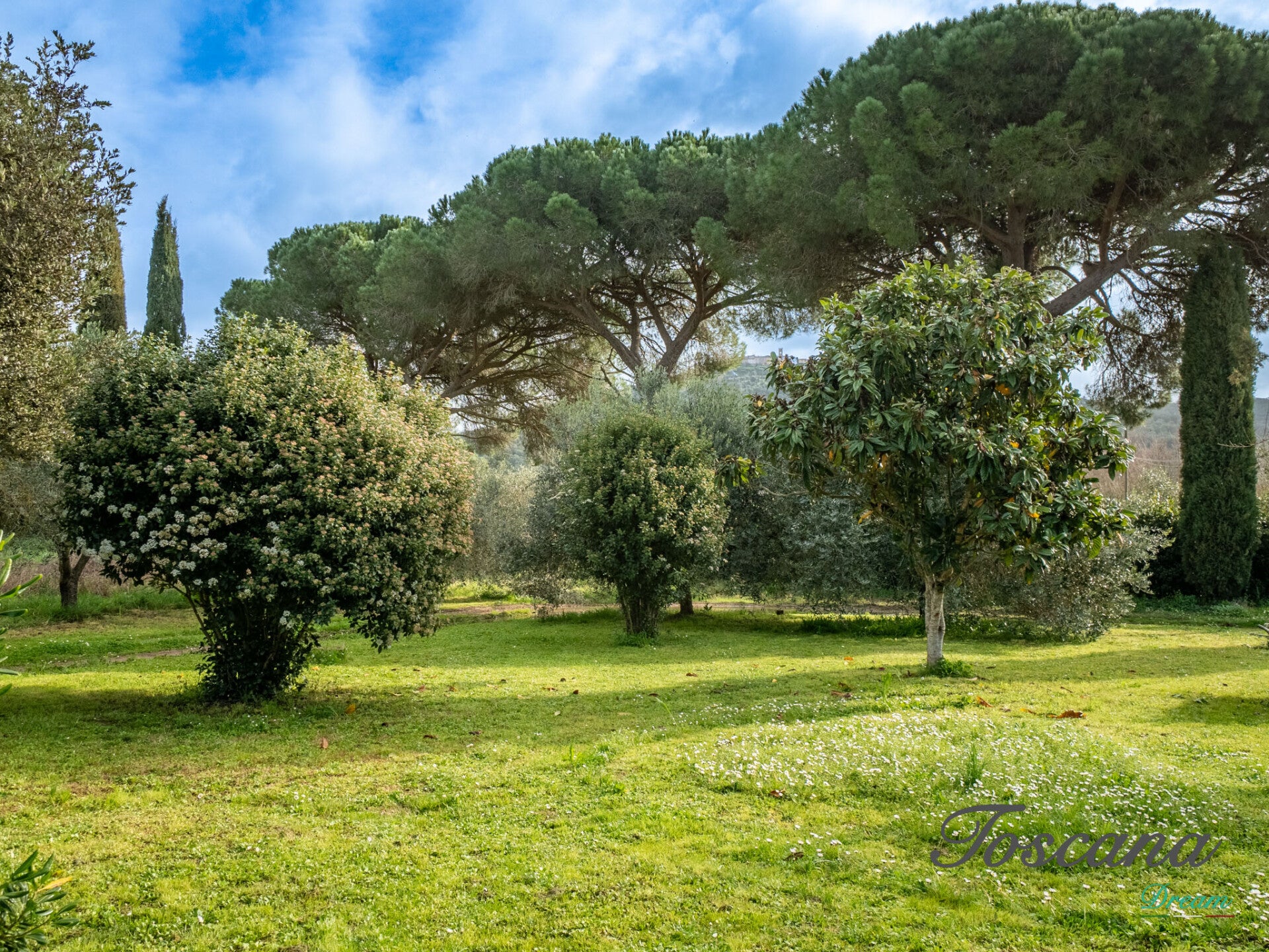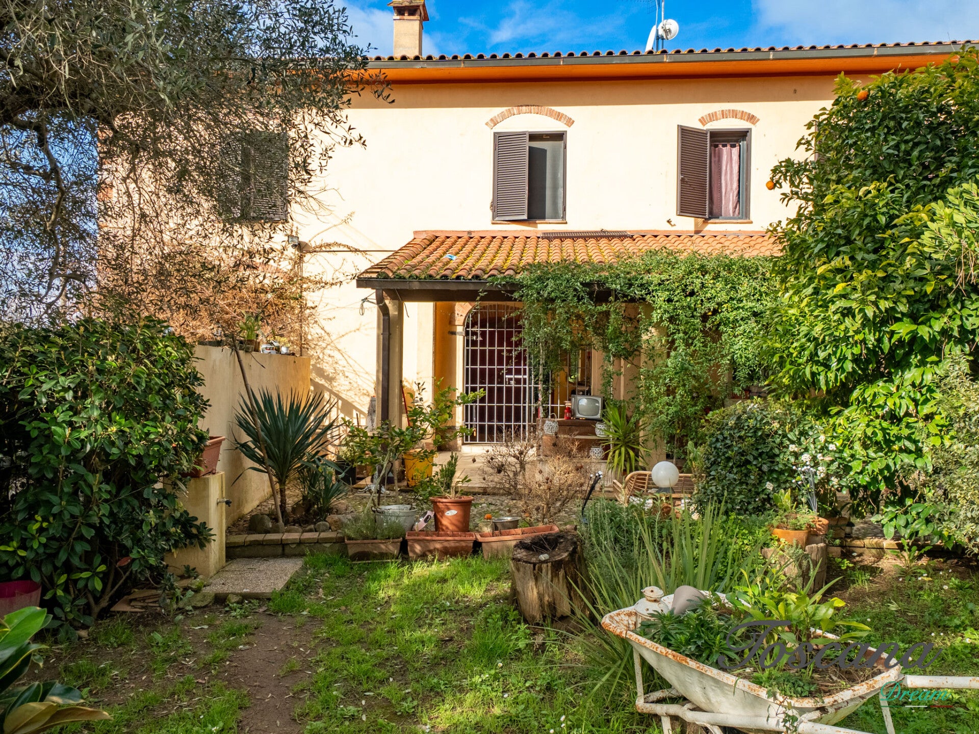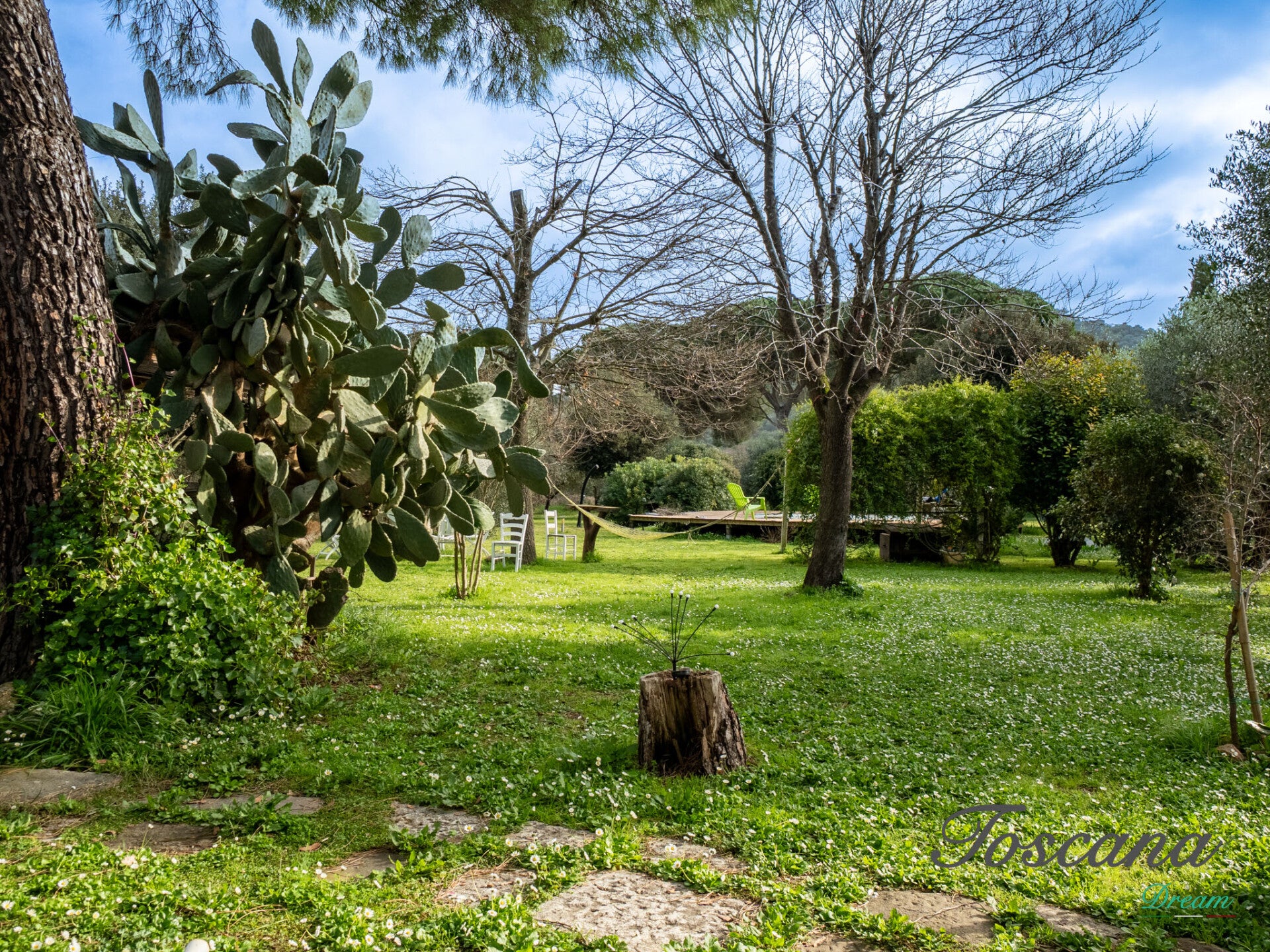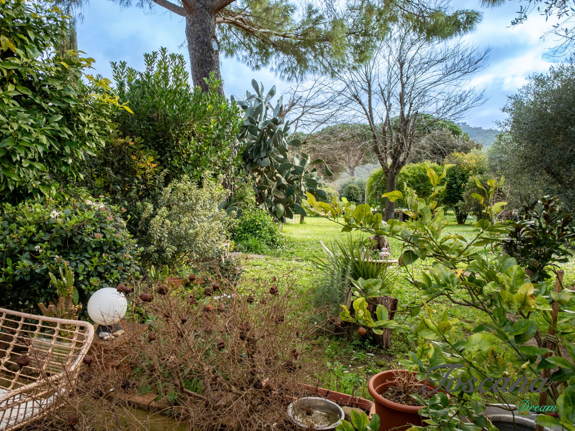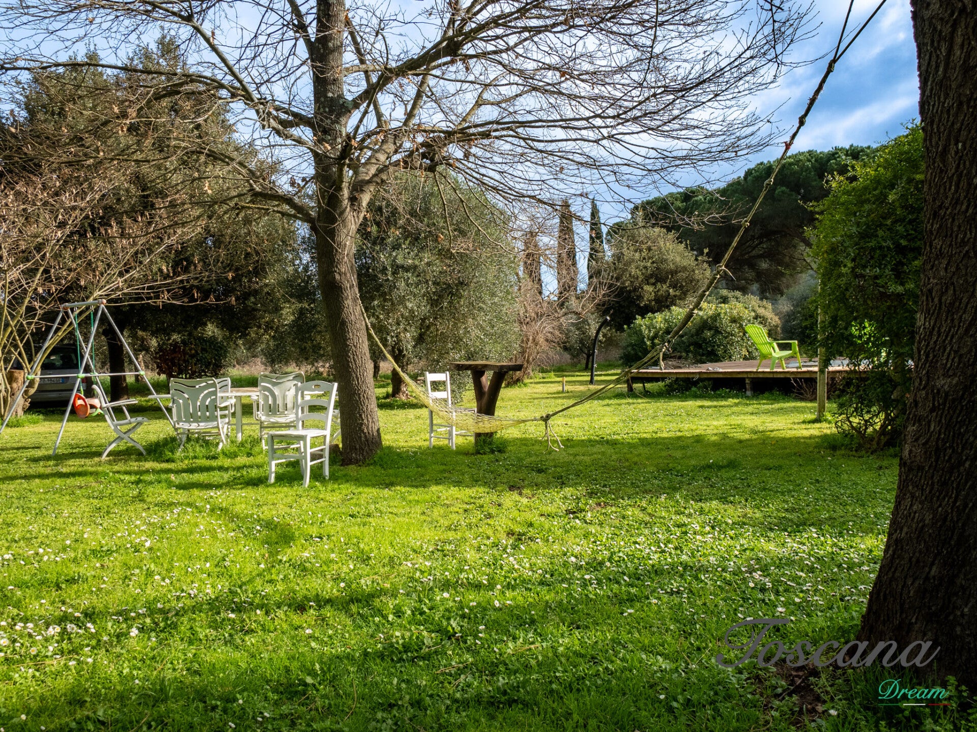 La proprietà è circondata da un ampio giardino, perfetto per momenti di relax all’aperto, cene conviviali o eventi immersi nella natura.